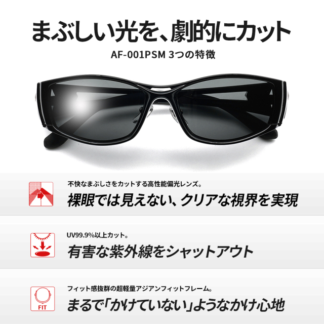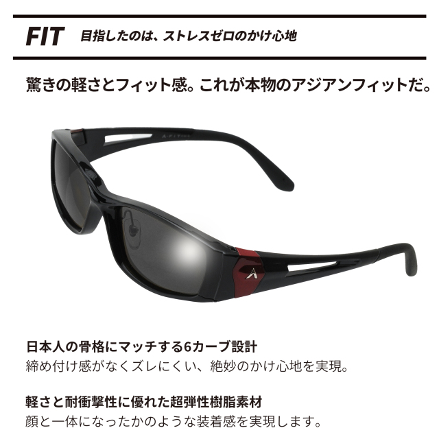 日本人の顔は、欧米人に比べて平面的で全面はひろくなっているため、欧米人向けのフレームだと締め付け感が強く、ズレが生じやすくなります。本商品のフレームは、アジアンフィット設計(日本人の骨格にあう緩やかなカーブ設計)で約4,000名を超える日本人の頭部データをもとに設計されており、顔を包み込むように快適に装着できます。
