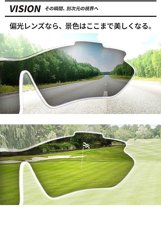 偏光レンズは、自動車のフロントガラスの反射光や芝生面、水面、路面のギラツキを除去し。クリアな視界を実現します。アウトドアの様々なあシーンで、コース状況やターゲットの位置を把握しやすくなり、景色をより美しく見せてくれます。
