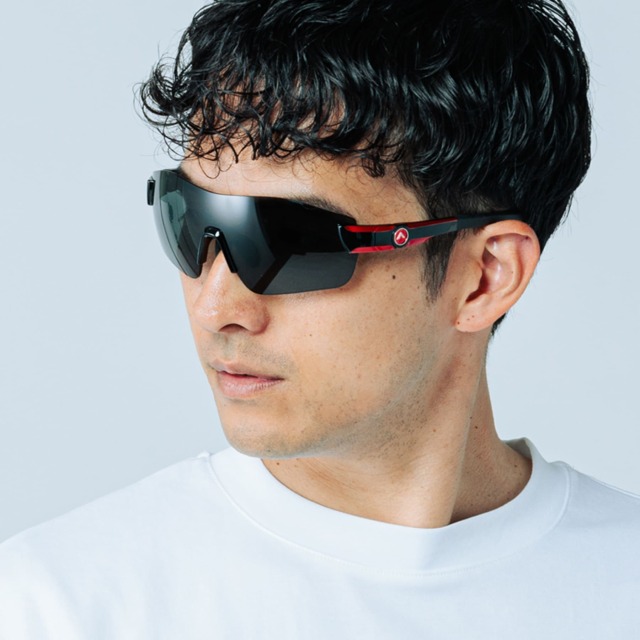 調節可能な芯金入りのノーズパッドでフィット感を自在に調節。鼻筋が細い方はノーズパッドの幅を狭め、鼻筋が高い方はノーズパッドを開きます。開き具合を調節することでレンズと眼の距離も調節できます。左の画像はパッドを狭めて着用しており、パッドを狭めた分サングラスの装着位置が高くなり眉毛が隠れています。右の画像はパッドを開いて着用しており、左の画像に比べてより深くサングラス装着し、レンズと頬の隙間が狭くなっています。