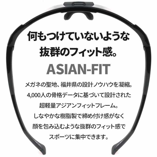 日本人の顔は、欧米人に比べて平面的で全面はひろくなっているため、欧米人向けのフレームだと締め付け感が強く、ズレが生じやすくなります。本商品のフレームは、アジアンフィット設計(日本人の骨格にあう緩やかなカーブ設計)で約4,000名を超える日本人の頭部データをもとに設計されており、顔を包み込むように快適に装着できます。