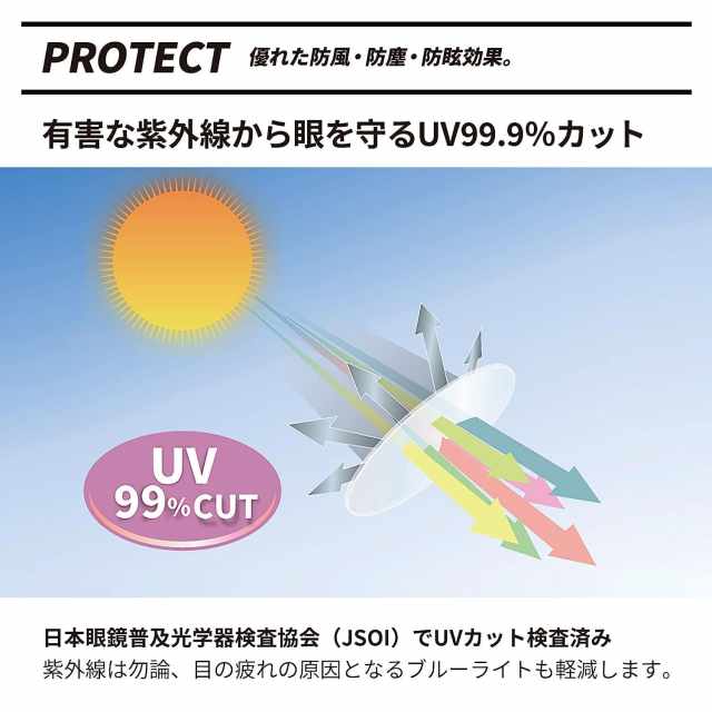 当商品のレンズは、検査機関で検査済のUV99.9%以上カットするレンズです。レンズ自体にUV吸収剤が練りこまれており、表面に傷がついてもUVカット機能は持続します。紫外線の影響を心配せずにアウトドアを楽しめます。
