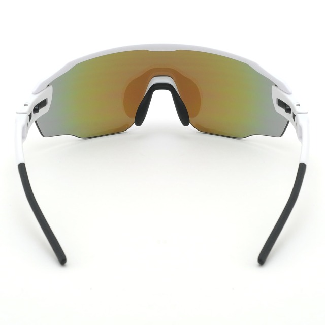 調節可能な芯金入りのノーズパッドでフィット感を自在に調節。鼻筋が細い方はノーズパッドの幅を狭め、鼻筋が高い方はノーズパッドを開きます。開き具合を調節することでレンズと眼の距離も調節できます。左の画像はパッドを狭めて着用しており、パッドを狭めた分サングラスの装着位置が高くなり眉毛が隠れています。右の画像はパッドを開いて着用しており、左の画像に比べてより深くサングラス装着し、レンズと頬の隙間が狭くなっています。