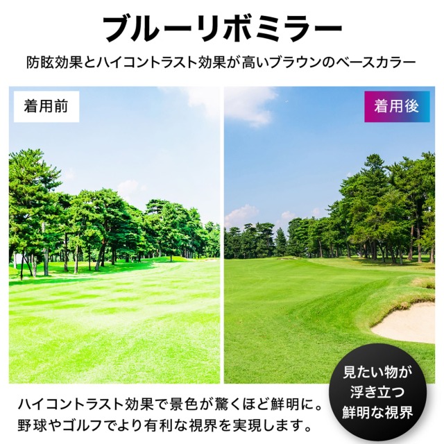 偏光レンズは、自動車のフロントガラスの反射光や芝生面、水面、路面のギラツキを除去し。クリアな視界を実現します。アウトドアの様々なあシーンで、コース状況やターゲットの位置を把握しやすくなり、景色をより美しく見せてくれます。