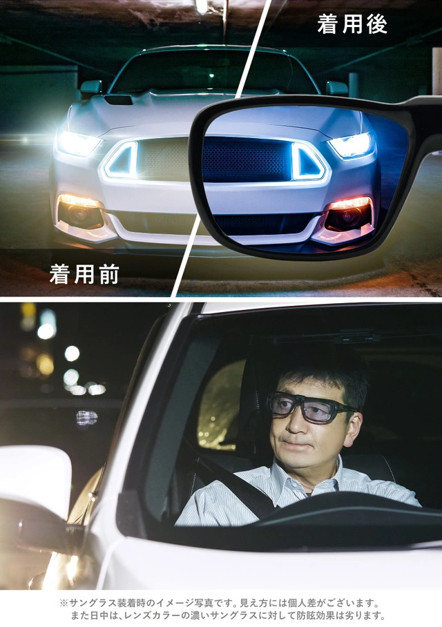 メガネをかけた方々が夜間運転の際、薄いレンズカラーでも対向車のヘッドライトの眩しさを和らげ、さらに、雨の日の乱反射や日中の眩しさも抑えます。