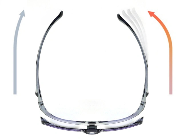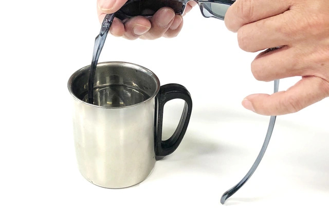 スマートプラスチックは、熱をかけることによって形状を調節できる特殊プラスチックです。大きめのマグカップ等に70~80度ぐらいのお湯をいれていただき、20秒程度加熱していただくことによって、テンプルを内側に曲げる等、フィット感を簡単に調節できます。