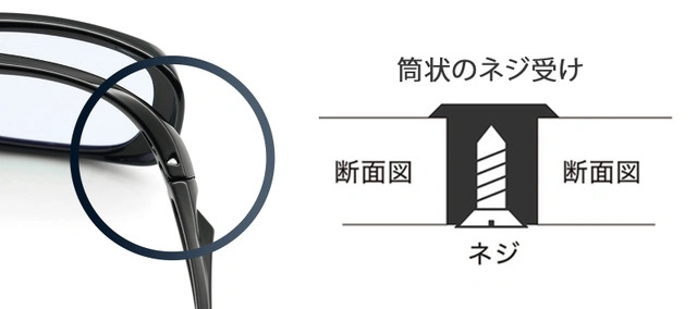 ネジの緩みとテンプルのバタつきを防止する、ダブルロック式ネジを採用した丁番。万一緩んでも簡単にネジを締めなおすことが可能です。