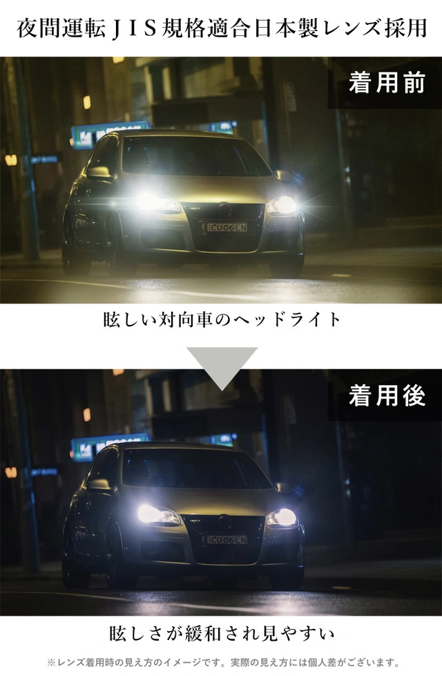 本商品は「夜間により見やすく快適に運転するため」に 少しでも明るい視界を確保し、 対向車のヘッドライト等の眩しさを和らげ、 信号機の色や標識が見やすい ことを目的に開発された夜間運転のためのJIS規格に適合する日本製レンズを採用しています。 また、夜間のウォーキングや自転車に乗られる際にも見やすく、日中のご使用でもコントラストを高めて見やすくなる商品です。