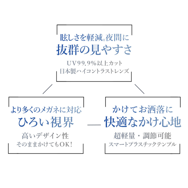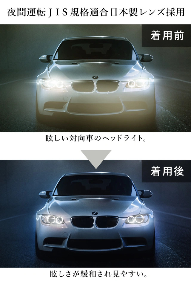 メガネをかけたドライバーの夜間運転に、薄いレンズカラーでも対向車のヘッドライトの眩しさを和らげ、雨の日の乱反射や日中の眩しさも抑えます。もちろんメガネ無しでもご使用可能です。(※上記画像は、サングラス装着時のイメージ写真です。見え方には個人差がございます。)