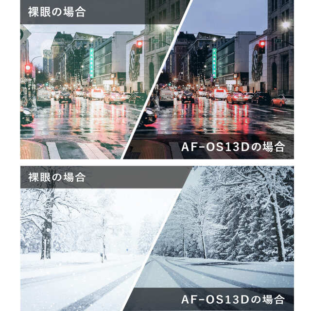 雪道の轍や凸凹道、吹雪などのたいへん視界が悪い場合でも、白さを際立たせて道路や景色がより見やすくなります。