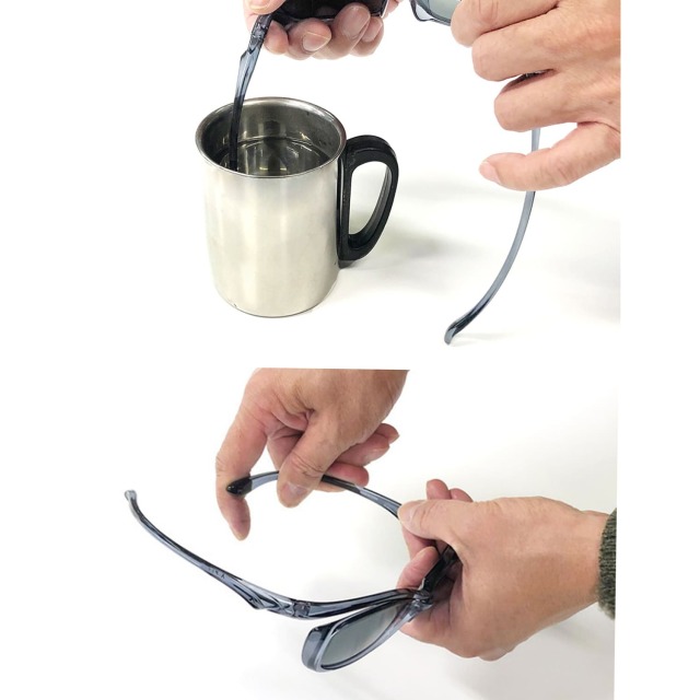 スマートプラスチックは、熱をかけることによって形状を調節できる特殊プラスチックです。大きめのマグカップ等に70~80度ぐらいのお湯をいれていただき、20秒程度加熱していただくことによって、テンプルを内側に曲げる等、フィット感を簡単に調節できます。