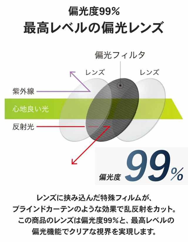 一般的なサングラスではまぶしい乱反射光をカットできません。偏光レンズはレンズの間に乱反射光をカットする特殊フィルムを挟み込み、眼に心地良い光だけを透過します。当商品には偏光度99%のレンズを採用しています。最高レベルの偏光性能で抜群の視界を実現します。