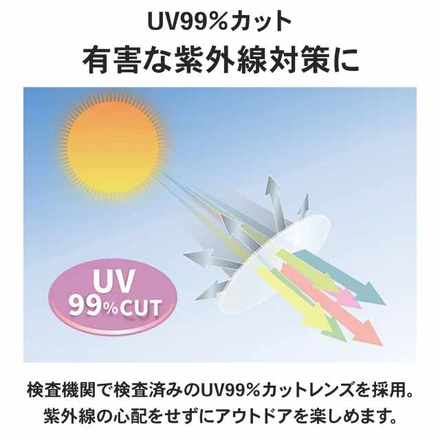 当商品のレンズは、検査機関で検査済のUV99.9%以上カットするレンズです。レンズ自体にUV吸収剤が練りこまれており、表面に傷がついてもUVカット機能は持続します。紫外線の影響を心配せずにアウトドアを楽しめます。