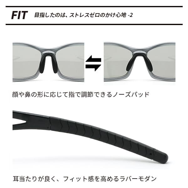 最高レベルの偏光機能でまぶしさを解消。8カーブレンズ設計で目の側面まで光や風の侵入を防ぎます。