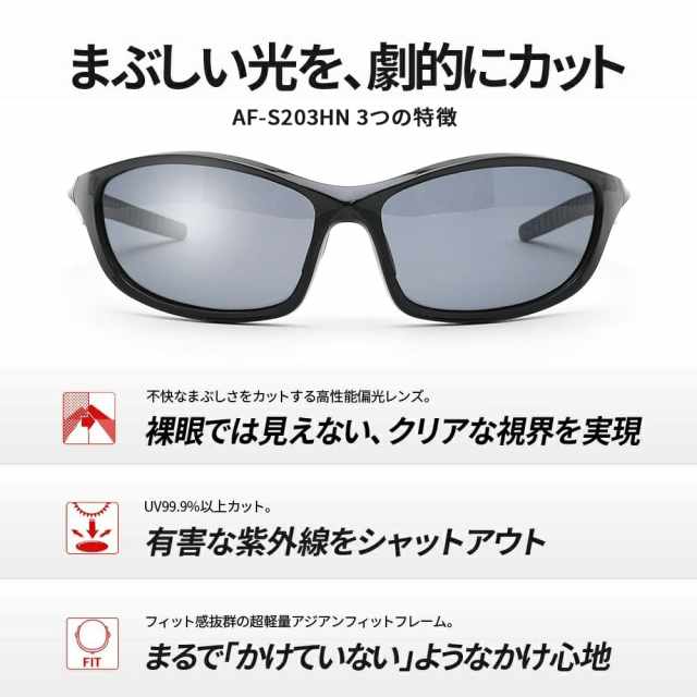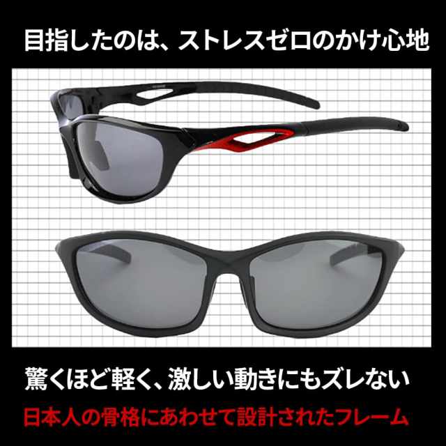一般的なサングラスではまぶしい乱反射光をカットできません。偏光レンズはレンズの間に乱反射光をカットする特殊フィルムを挟み込み、眼に心地良い光だけを透過します。当商品には偏光度99%のレンズを採用しています。最高レベルの偏光性能で抜群の視界を実現します。
