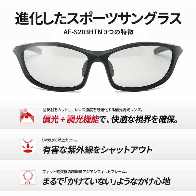 自動で快適な明るさを確保できる偏光調光サングラス。8カーブレンズ設計で目の側面まで光や風の侵入を防ぎます。