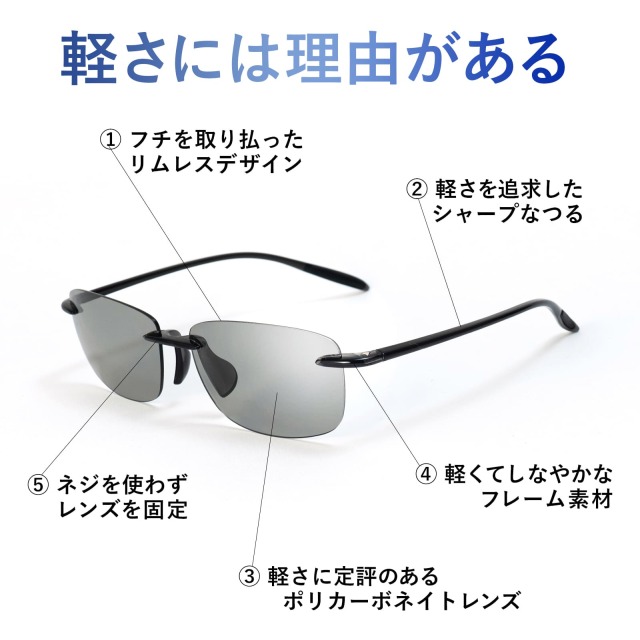 レンズのフチを取り払い、フレーム・レンズは素材から設計まで軽さを追求。