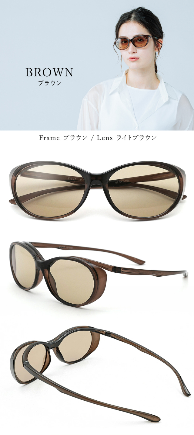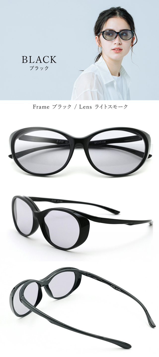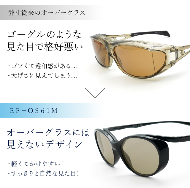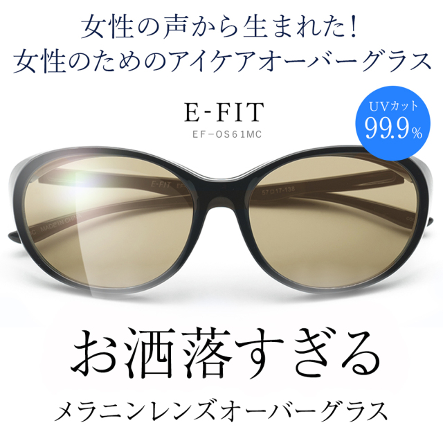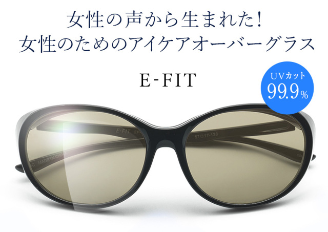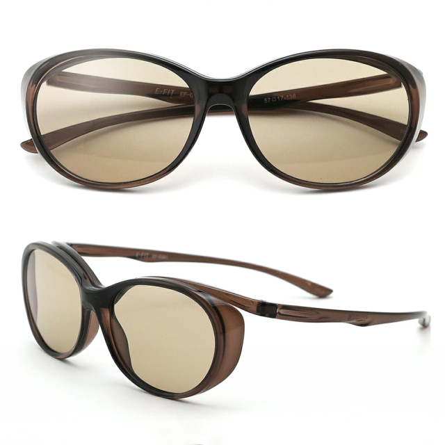 「普段愛用しているメガネの上から重ねてかけられるお洒落なサングラスがあったらいいのに...」「紫外線からしっかりと目を守りたい...」そんな願いを叶える特別なオーバーグラスが「E-FITアイケアオーバーグラスEF-OS61」です。またメガネなしで、そのままかけることもできます。