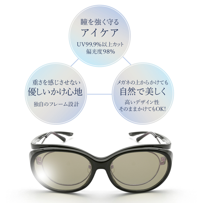 「オーバーグラス」の一番の特徴は眼鏡をかけたまま、上からパッとかけられること。 従来のオーバーグラスの「ごつくて恰好悪い」というイメージを払拭し、うすさ・軽さ・美しい曲線にとことんこだわり、機能性と優しく包み込むデザインの両立に成功しました。さらに眼鏡なしでもお洒落にかけられる自信作です。顔は、いわばその人のアイコンとなる重要な部分です。いくら高性能で紫外線をカットできるサングラスでも、女性は色やデザイン、見た目の優先順位が高い場合がほとんどです。このオーバーグラスは、従来のオーバーグラスの「ごつさ」をなくし、 自然に美しく見えるデザインです。