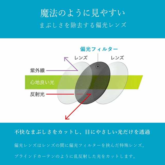 一般的なサングラスではまぶしい乱反射光をカットできません。偏光レンズはレンズの間に乱反射光をカットする特殊フィルムを挟み込み、眼に心地良い光だけを透過します。当商品には偏光度99%のレンズを採用しています。最高レベルの偏光性能で抜群の視界を実現します。